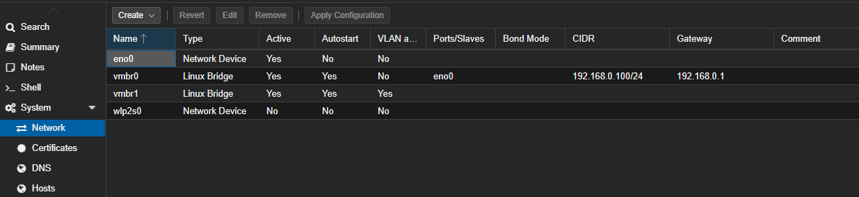 - Navigate to your Proxmox Node and select the System > Network tab.